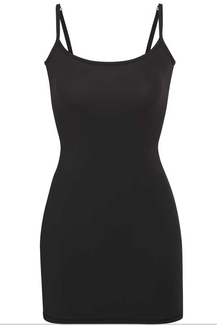 The SKIMS Fits Everybody Slip Dress in Onyx is a versatile, body-hugging dress known for its buttery-soft fabric and comfortable, form-fitting design. It is made from a lightweight, ultra-stretchy material that moves with your body and is available in both a mini and a long (maxi) length. The Onyx color is a classic black.